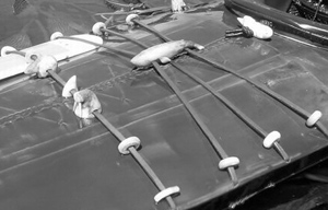 Le pont du kayak était muni d'outils et d'armes. Ceux-ci étaient fixés sur le kayak à l'aide de courroies en peau, comportant de petits éléments en ivoire ou en os permettant de les resserrer.